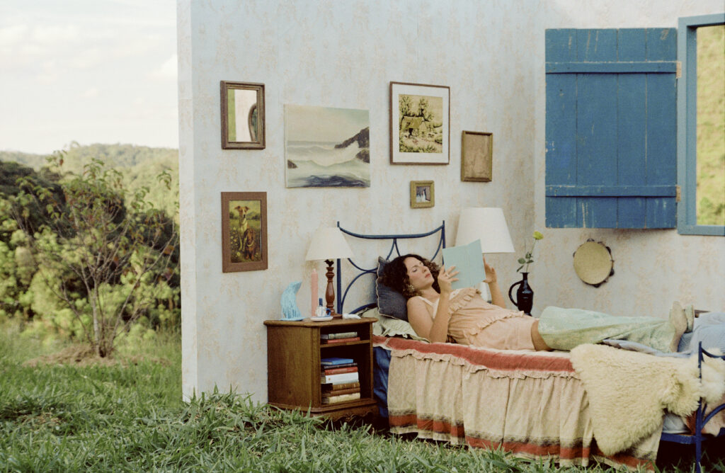 O clipe, por exemplo, traz esse quarto cenográfico no meio do mato, essa sensação de estar num quarto de sonho. Já o audiovisual foi feito pela Bruna Moraes e pela Gabriela Boelho, uma dupla incrível de cineastas. A gente gravou tudo em película, em Cunha, num sítio chamado Arreza. Foram dois dias mágicos: oito mulheres juntas, imersas na natureza, criando.
