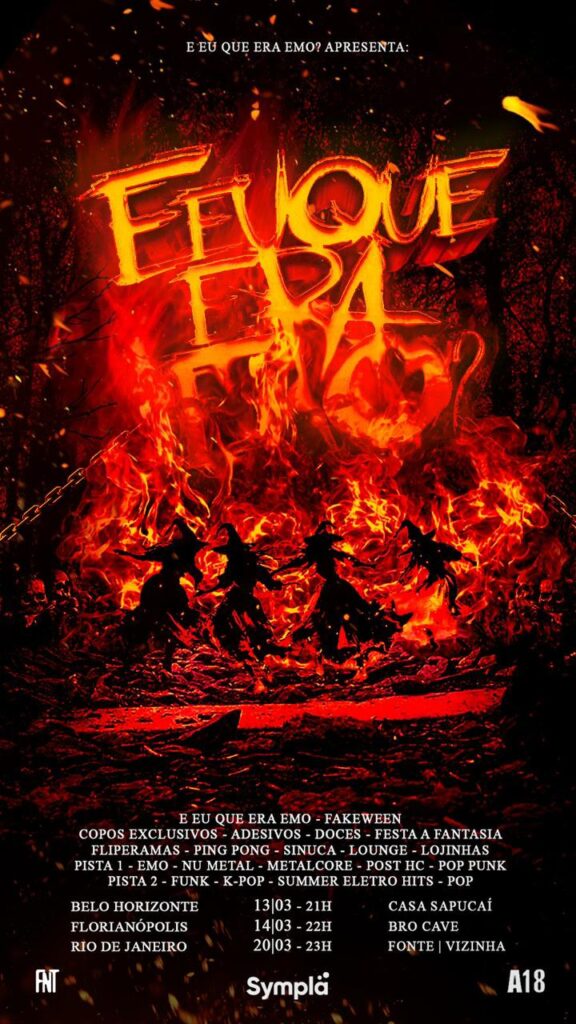 A próxima edição da E Eu Que Era Emo será um especial Fakeween à fantasia e acontece nos dias 13, 14 e 20 de março nas cidades de Belo Horizonte, Florianópolis e Rio de Janeiro, respectivamente. Confira mais informações abaixo. Ingressos à venda no Sympla.