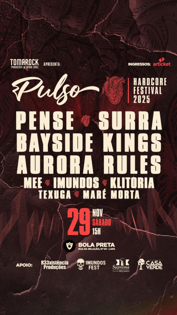 O Pulso Hardcore é um evento idealizado, promovido e produzido pela Tomarock Produções, uma das maiores produtoras independentes do Rio de Janeiro, responsável por muitos eventos incríveis que alimentam a cena independente na cidade, seja na região central como na baixada e nos bairros de periferia. Ir no evento é, além de uma oportunidade de conhecer novas bandas e conferir de pertinho shows de bandas consagradas, como Aurora Rules e Bayside Kings, também uma forma de apoiar o trabalho de uma equipe dedicada, que pensa em cada detalhe para que a cena da cidade continue recebendo shows incríveis e promovendo eventos acolhedores, cheios de diversidade e com espaço para todos. Se você curte rock independente e quer que esses eventos continuem acontecendo na cidade, apoie o trabalho de quem faz acontecer. Faz toda diferença.